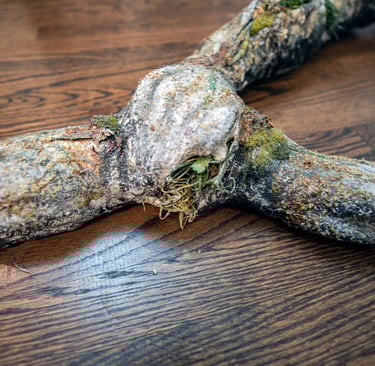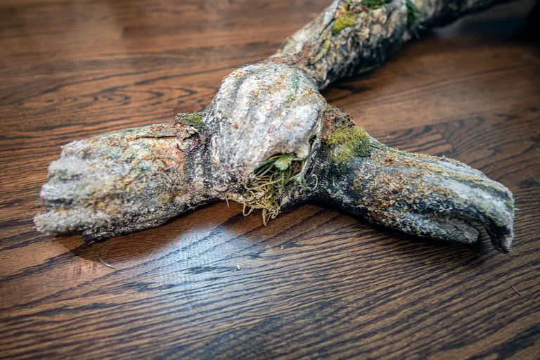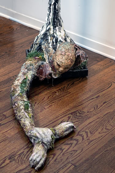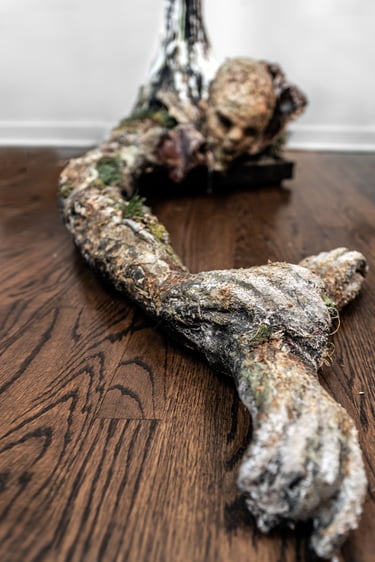 Found and repurposed objects; Wood; Foam; Plaster; Dried moss; Led lights; Paint.