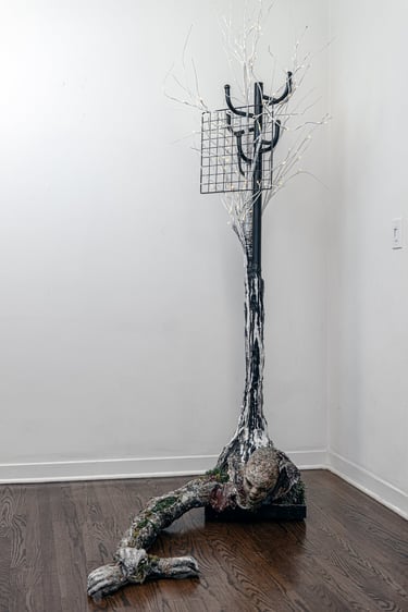 Dichonotree is a portmanteau of both its literal meaning as a coat rack, an article of furniture on which to hang preconceived notions and a living, bifurcating force of growth and novelty.