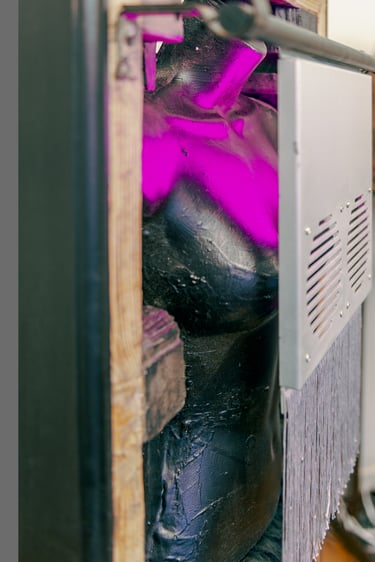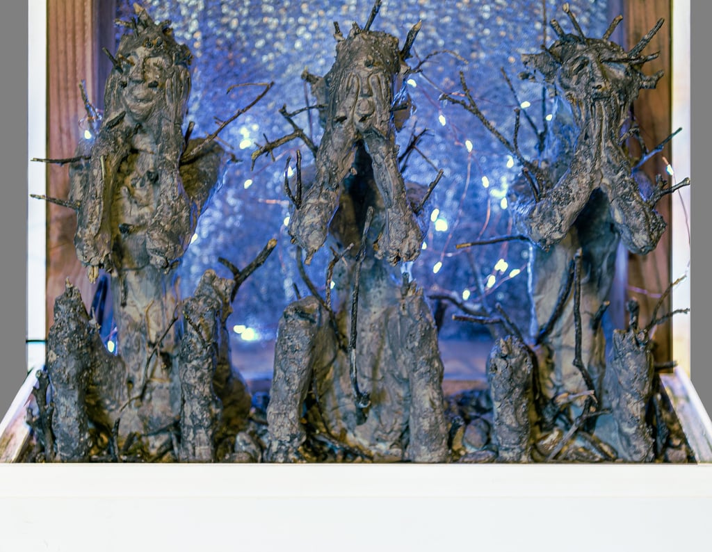 Wood; Clay; Aluminum; Cloth; Wax; Mannequin bust; Magnifying glass; Inkjet print; Paint; Led lights.