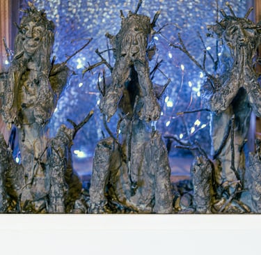 Ernst Haeckel, the German romantic celebrated for merging science and art was a younger contemporary and admirer of Charles Darwin and did much to promote his theories. He put together the word ecology and is known among his prolific works for his illustrations of evolutionary trees. The phylogenetic topiary has since accrued branches, in reverse proportion to the extinctions perpetrated by the human animal sporting an inverted tree of life printed a t-shirt. The roots have also been scrutinized to reveal they are not only branchlike but reticulate and intertangled in webs. In the mid seventies Carl Woese revolutionized microbiology with the discovery of the third kingdom of life, adding Archaea to the known two, Eukaryotes (nucleus endowed cells) and Bacteria. This led to the studies of horizontal gene transfers (HGT) which can occur between divergent species through processes of transformation, conjugation and transduction, thus laterally bridging different domains of life. At the distant source of the RNA manipulations that made the Covid-19 vaccine possible are three kingdoms, original strands now in the guise of three wise monkeys, degenerated into malformed gargoyles but who still know how to keep a secret amidst genes moving sideways. The sinister story they withhold is that of a single lineage who tore the tangled interspecies mesh with its alienated intention and left a messy track of carnage and bondage. They know the contender who believed was the fittest and became the self-appointed interpreter of nature is really a time-traveling centurion, an uprooted enforcer of dependency with a conversion plan. Its altar is a confessional with a kneeling bench padded with the scalps of exploited species, tokens of collateral damage to the biosphere, for the adulation and supplication of its subjects who in the soils of insurgencies and revolutions, count the coins of their Judas pay-off by their land-grabbing creditor, the virtual priestess and secular absolver of their original debt. The deracinated entity finds anchor in mercenary populations, rules them with fertility rites from behind a shield of equanimous androgyny, proud matron of an expedient technocracy that induces a desire for perpetual growth in her dwarfed slaves and wears their emancipation like a fetish.