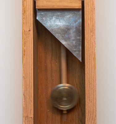 In a metaphysical come-back, the clock object is an invitation to time travel this suppression and unravel its hard-wired causality. Fast forward to the extraction of duration from the segmentation of linear tracks. Past the aperture of a hypnotic pendulum undercut by the shutter of a guillotine and with a ready-to-grip handle, to a faceplate turned towards another substrate, the absence inherent to Heidegger's Being and Time.