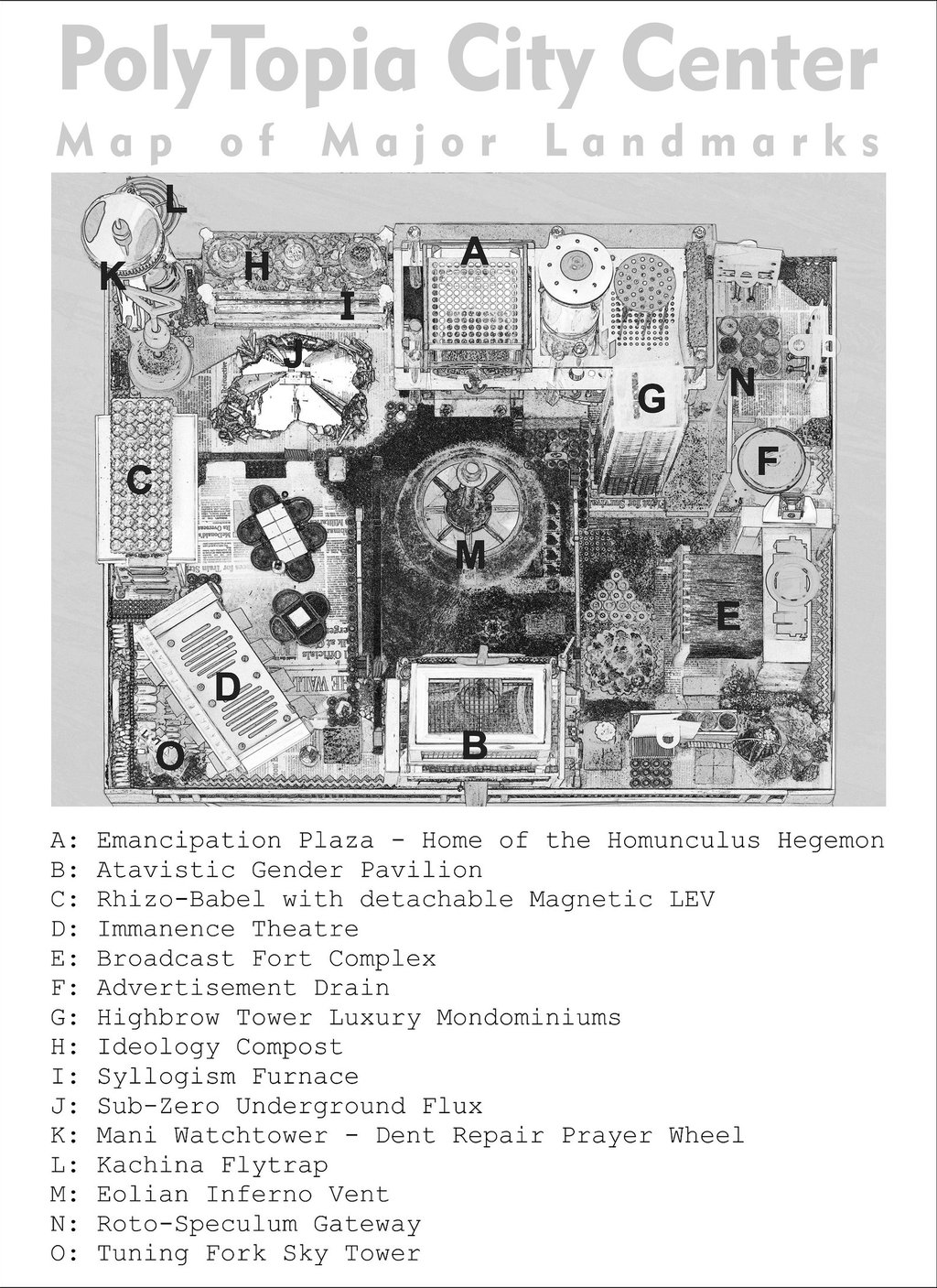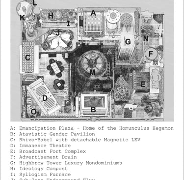 Thus 'Emancipation Plaza' is the home of the 'Homunculus Hegemon', ensconced in a cockpit looming over 'Inferno Square', gazing across its ventilated abyss at the animated shopfronts of the 'Atavistic Gender Pavilion'…