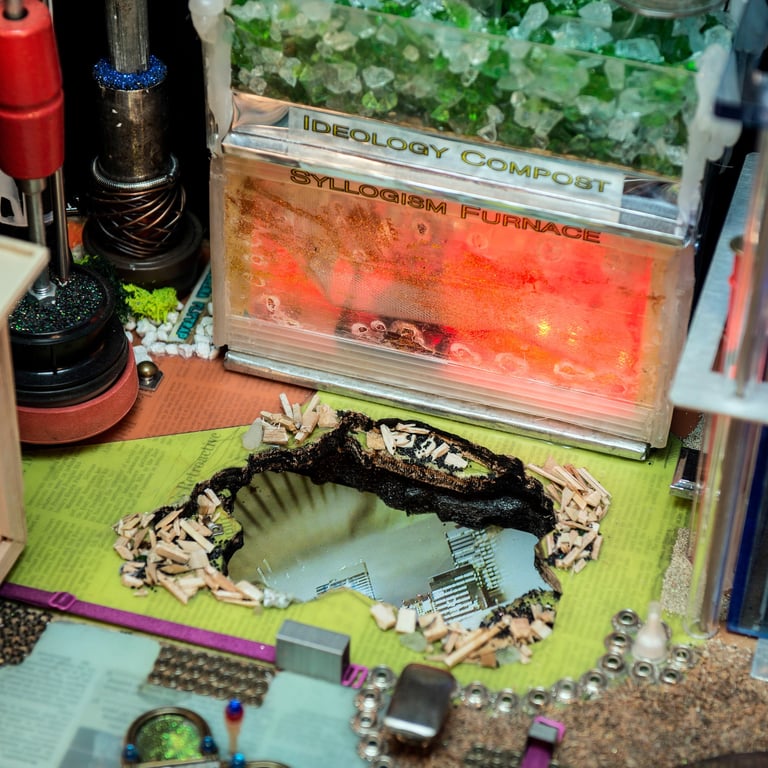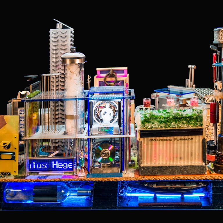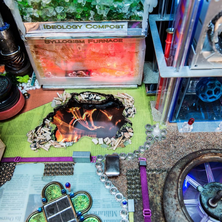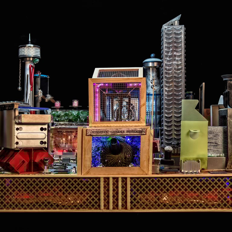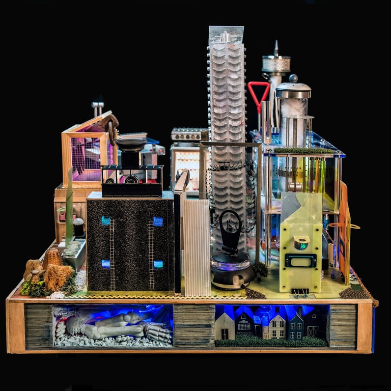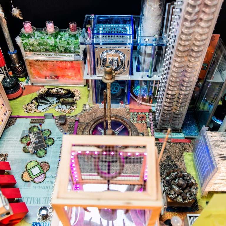 There is a persistent heterogeneity to the materials and methods used in these elaborate tinkerings, from traditional craftwork to a re-arrangement of either found or off-the-shelf consumer objects and while these bricolages daftly orchestrate an array of methods and techniques, blurring disciplines, they also play on the ideology/utopia tandem that stretches from Aristotle's Polis to the blueprints of the ideal modern city.