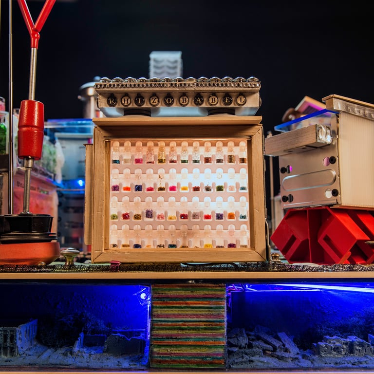 Various found and repurposed objects, Motors, Leds, Embedded video and sound.
