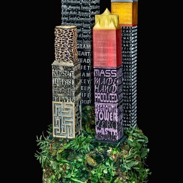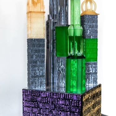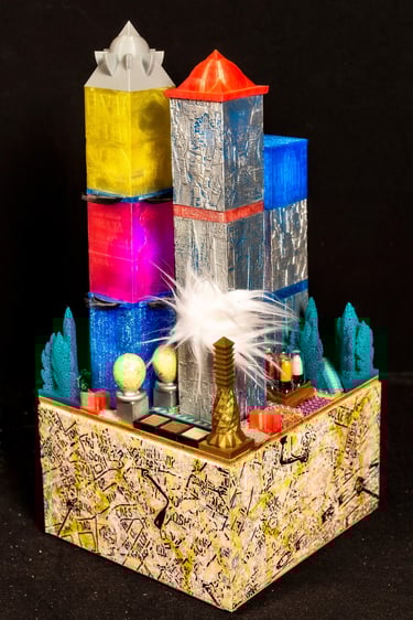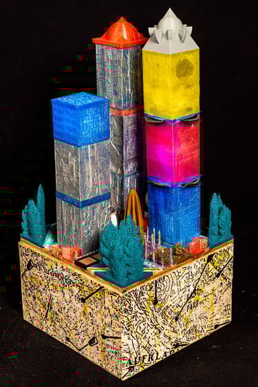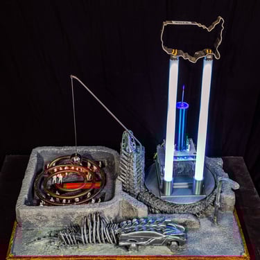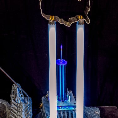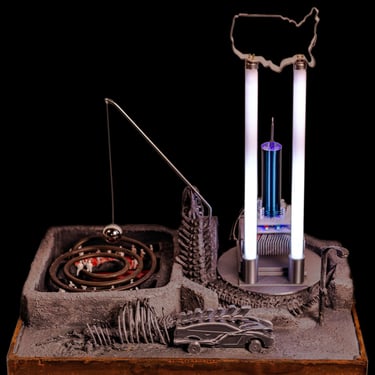 Wood, Foam, Paint, US map cookie cutter, Tesla Coil with speaker, Neon bulbs, PLA 3d printed parts, HO scale figures, Name badge with running text, Pendulum, Looping audio track.