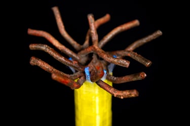 Wood, plastics, PLA 3d printed parts, Motor, Neopixel LEDs, Paint, Gold Leaf, Admiral Fitzroy Storm Glass.