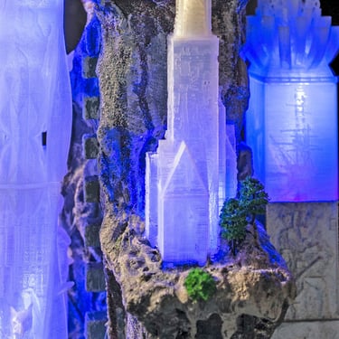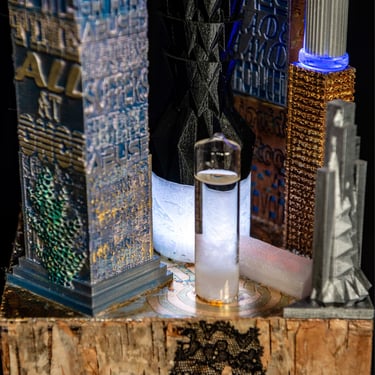 Wood, Lace, PLA 3d printed parts, Motor, Neopixel LEDs, Paint, Gold Leaf, Admiral Fitzroy Storm Glass.