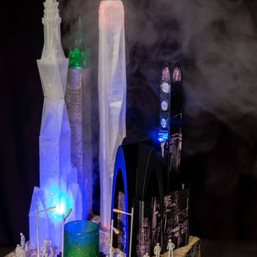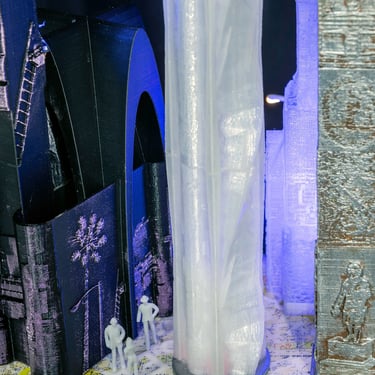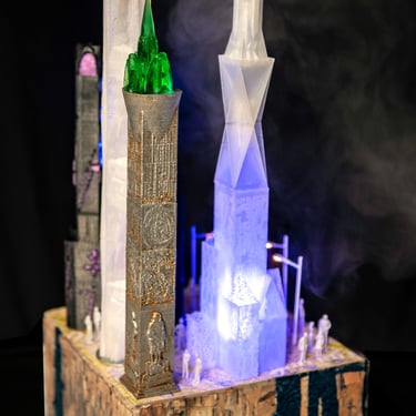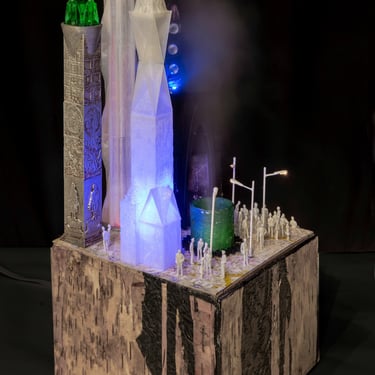 Wood, Lace, PLA and SLA 3d printed parts, Neopixel and other LEDs, HO scale streetlights and figures, Time controlled Humidifier.