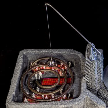 Wood, Plaster, Cloth, PLA 3d printed parts, LEDs, Motors and fans, Pendulum..