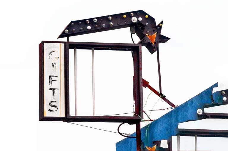 As retailers relocate or companies liquidate, they pull down their signs, leaving behind the empty sign holder. Each piece in the series showcases such an abandoned and gutted apparatus, spotted by the artist who makes it the subject of a dedicated photoshoot and subsequent study.